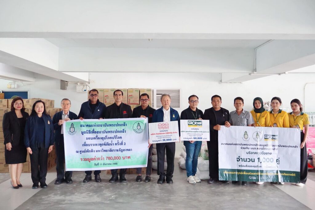 วันที่ 11 ธันวาคม 2568 สมาคมแห่งสถาบันพระปกเกล้า และมูลนิธิเพื่อสถาบันพระปกเกล้า นำโดย นายมหรรณพ เดชวิทักษ์ นายกกิตติมศักดิ์ ดร.ธิติมา หล่อพิพัฒน์ กรรมการสภาสถาบันผู้ทรงคุณวุฒิสถาบันพระปกเกล้าและนายกกิตติมศักดิ์ นายนนท์อนณ บัวขวัญโภคินกุล ที่ปรึกษาสมาคม พร้อมด้วย นายสุพัศชัย วิรัตกพันธ์ และ บริษัท สยามโกลบอล เฮ้าส์ จำกัด (มหาชน) ได้ร่วมเดินทางไปมอบเครื่องอุปโภค – บริโภคช่วยเหลือผู้ประสบอุทกภัยในพื้นที่ อำเภอหาดใหญ่ จังหวัดสงขลา โดยมี ผู้ช่วยศาสตราจารย์พิเชษฐ์ จันทวี อธิการบดีมหาวิทยาลัยราชภัฏสงขลา ได้ให้การต้อนรับและเป็นผู้รับมอบ และมีนายอนุมัติ อาหมัด อดีตสมาชิกวุฒิสภา ให้เกียรติร่วมในพิธีส่งมอบด้วย