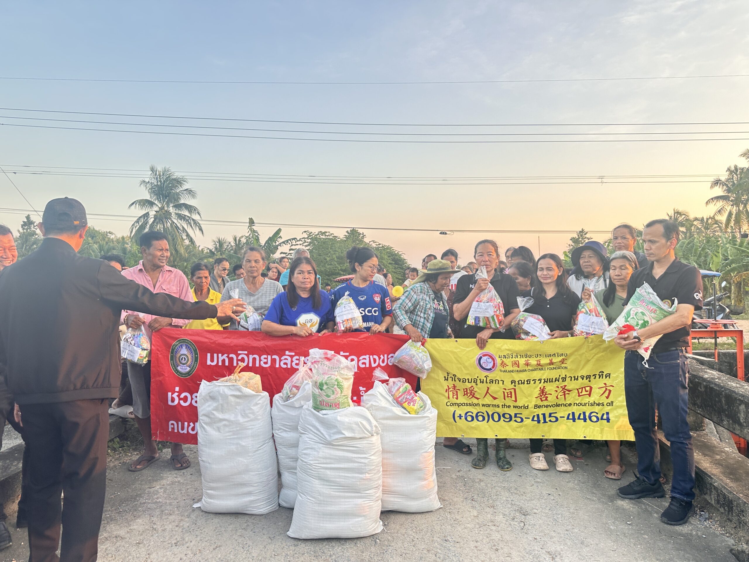มูลนิธิเพื่อสถาบันพระปกเกล้า สมาคมแห่งสถาบันพระปกเกล้าร่วมกับมหาวิทยาลัยราชภัฏสงขลา โดยผู้ช่วยศาสตราจารย์พิเชษฐ์ จันทวี อธิการบดีมหาวิทยาลัยราชภัฏสงขลา และท่านที่ปรึกษาสมาคมแห่งสถาบันพระปกเกล้า คุณนนท์อนณ บัวขวัญโภคินกุล และคณาจารย์ ร่วมเดินทางไปแจกของและอาหารให้แก่ผู้ประสบภัย จำนวน 3,000 ชุด ในพื้นที่อำเภอสิงหนคร อำเภอกระแสสินธุ์ อำเภอสทิงพระ และอำเภอระโนด เมื่อวันที่ 2 ธันวาคม 2568
