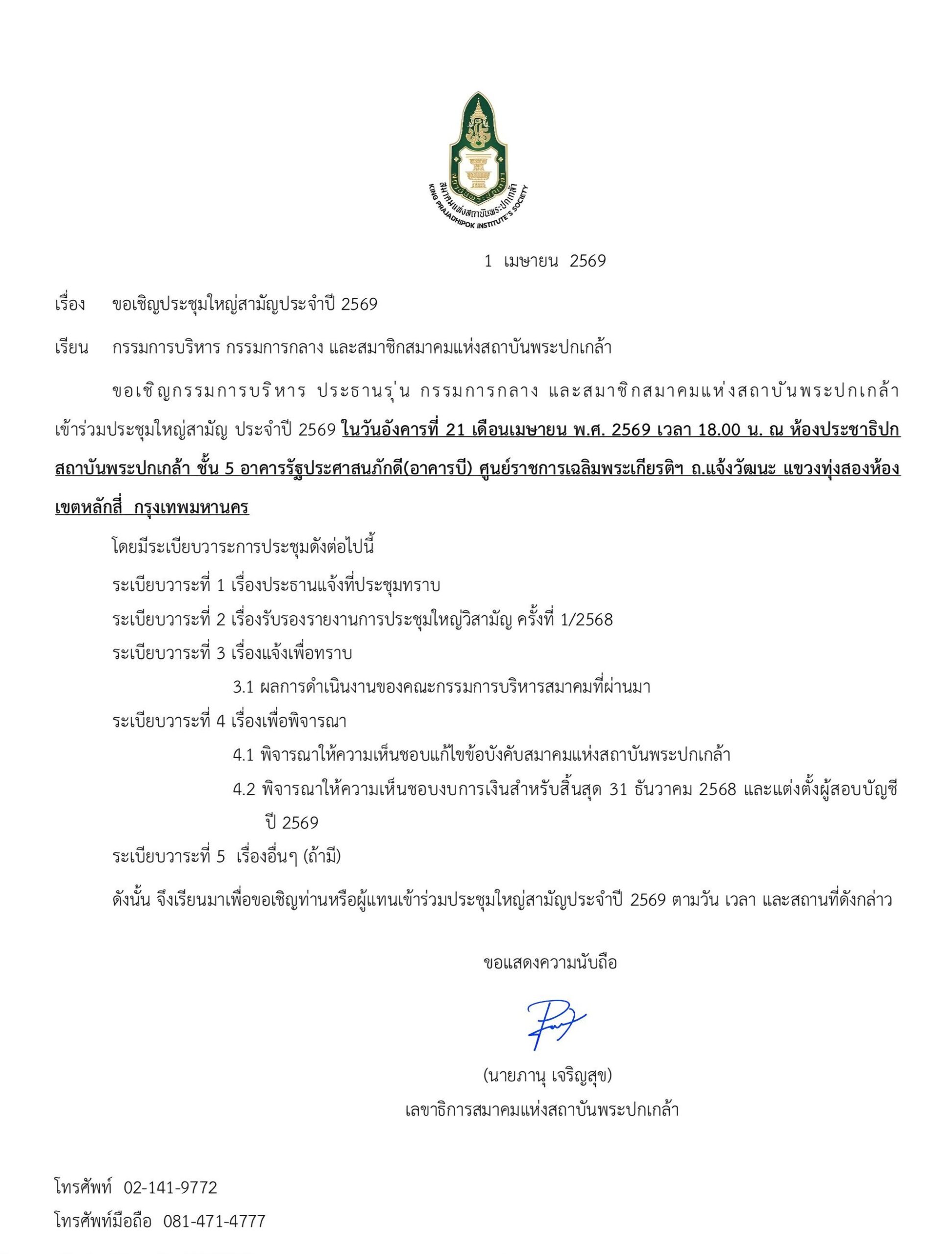 ขอเชิญร่วมประชุมใหญ่สามัญประจำปี 2569 ในวันอังคาร ที่ 21 เมษายน พ.ศ. 2569 เวลา 18.00 น. ณ ห้องประชาธิปก สถาบันพระปกเกล้า ชั้น 5 อาคารรัฐประศาสนภักดี (อาคารบี) ถนนแจ้งวัฒนะ แขวงทุ่งสองห้อง เขตหลักสี่ กรุงเทพฯ ดาวน์โหลดเอกสารประกอบการประชุม (ด้านใน)April 1, 2026 Read More